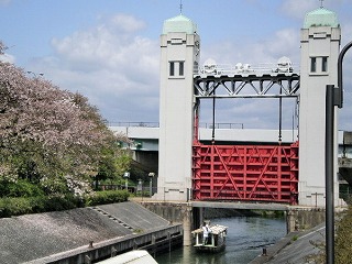 折り返し地点の三栖閘門(みすこうもん)で一旦下船し、資料館を見学です。濠川と宇治川の合流地点にあるこの門は、川の水位を調整するための門。昭和4年完成とは思えないモダンな印象です。当時は、門の開閉により、川の水位を調整してそれぞれの川へ舟が進んだのだそうです。