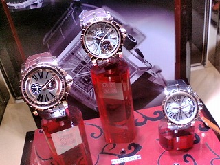 で、一応、展示品も見ておこうとチェックしてみると、腕時計のほか、女性向けのアクセサリーも少しあり。どの展示品も値札付きでアクセサリーに比べると腕時計はかなり高額。。腕時計の中には5,000万円超のものも。。下世話ながら思わず『家買える…』と思ってしまいました。。(右下写真:中央がその時計です。。)
