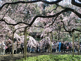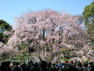 入園し、目指すはもちろん“しだれ桜”。樹齢60年の巨大な桜の付近は予想通りかなりの人混みです。空いている箇所は花の咲いていない枝付近ばかり。。綺麗に咲いている枝の近くは写真撮影待ちの状態でした。。