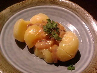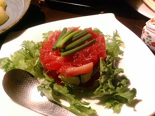 さて、お料理。おすすめメニューから定番ものまで、いつものように色々といただきました。じゃがバターの塩辛のせは北海道の味。塩辛がある時には家でもやる好きな食べ方です。マグロとアボカドのサラダは、大好きなアボカド少なめ・・・マグロよりもアボカド好きにとっては、ちょっと残念。。