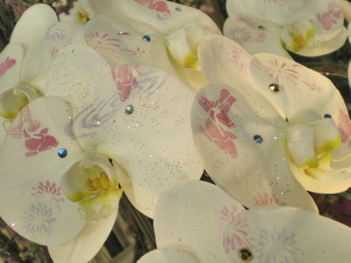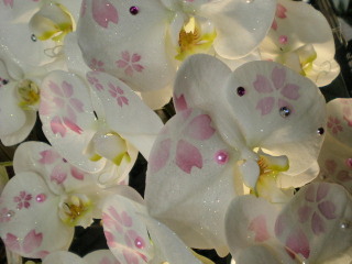 蘭の花びらに桜や金魚などのデザインがされている化粧蘭。花にとっては良いのか悪いのか…でも白地にピンクの柄がキレイでした。