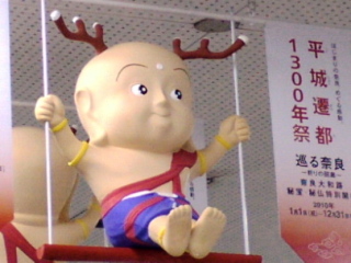 今回は京都から近鉄特急を利用し、奈良へ。近鉄奈良駅では、せんとくんが天井から下がったブランコに乗ってお出迎えです。