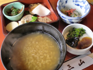 お腹もすいてきたので、お昼ご飯を食べにレストランへ。ネットで事前にチェックした和風レストラン三山です。ほうじ茶で生米から炊き上げるという昔ながらの奈良の茶粥が有名なお店だそうです。