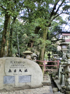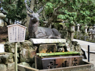 大和茶粥を食べお腹もいっぱいになったところで、春日大社へと行ってみました。表参道をのんびりと歩いていくと、鳥居が見え、手水所があります。こちらの手水所は伏鹿手水所。鹿です。昔、春日大社の祭神が神鹿に乗ってやってきたという言い伝えがあるとの話を聞いて、奈良に鹿が多いのに納得です。