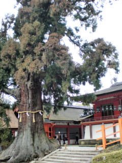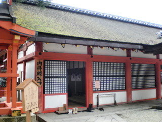 御本殿の横にある大杉は樹齢1000年近いという大樹。そして、内侍殿(ないしでん)。内侍殿の中には「神様へのお便り」という紙とペンが置かれ、お願いごとを書いて預けてくることができます。