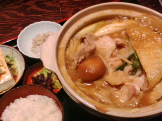 で、注文したのは日替わりちゃんこ定食の鶏と豚肉の味噌ちゃんこ。小さなガスコンロに1人用鍋が設置され、運ばれてきます。お鍋の中には野菜がたっぷり。そして、みそ味のスープには生姜が入っていて体が温まる。。寒い日にはぴったりの味でした。