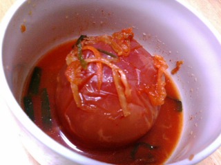 物産展で購入した後、食べるタイミングを逃し、冷蔵庫に入れっぱなしになっていた丸ごとトマトキムチ。賞味期限間も近くなり、発酵して酸っぱくなっているかも・・・ちょっと気になるところです。。