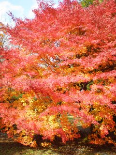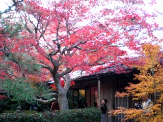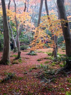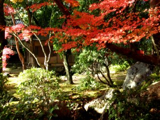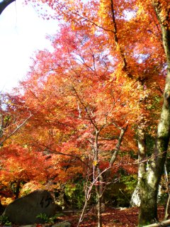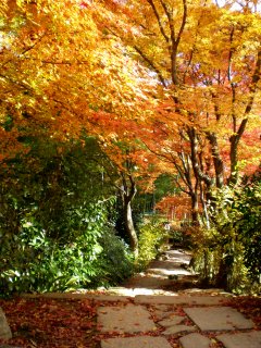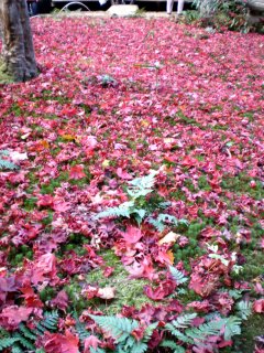 こちらの厭離庵は紅葉の時期だけ一般公開されているとのこと。また、最近テレビで紹介されたらしく観光客がかなり増えた場所でもあるそうです。細い参道を進むと門が見え、本堂前の庭には真っ赤な散紅葉。紅葉はやっぱり赤が綺麗です。