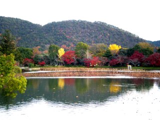 清涼寺を後にし、大覚寺へと向かいます。駐輪場近くにあるのは大沢池。かつては平安貴族が舟遊びをしたと言われたところだそう。風がほとんどないので、水面には鏡のように紅葉が映り、綺麗です。