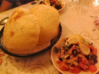 まず最初に出てきたのは、ほうれん草のスープ。そして、オリーブサラダにトルコのパン・エキメキ。エキメキは焼きたてアツアツ…パンの中は空洞で膨らんでいます。