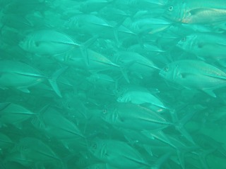 1本目。潜行してすぐギンガメアジの群れです。しかも、ギンガメアジに混じって、ロウニンアジ、ナポレオンも。しばらくすると、バラクーダが登場。こちらも群れで悠々と泳いでいます。その後もカンムリブダイやグレイリーフシャークなど見たかった魚たちが次々と登場。豪華フル出演。大満足