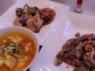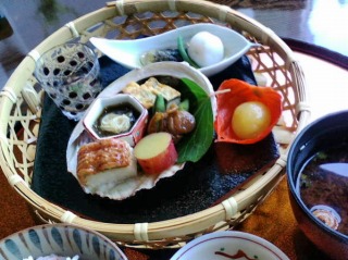 お料理は籠の中に煮物などがちょっとずつ入ったかわいらしい料理。そして、食後のデザートはストロベリーソースのかかったヨーグルトムース。ランチのデザートはどちらかというと小さめサイズになっていることが多いですが、こちらのは比較的大きめ。お料理、デザートともに美味しくいただきました。