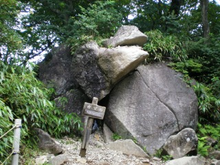 そして、最後は、弁慶が頭上の岩が落ちてくるのではないかと七回も後ずさりしたという弁慶七戻り。筑波山では有名な岩らしい。。人の何倍もある大きな岩が今にも落ちてきそうな感じです。