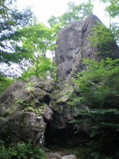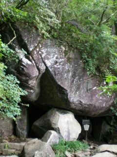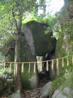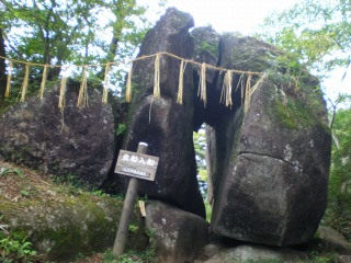 母の胎内くぐりと高天原。母の胎内くぐりは、岩の奥につながっていて、くぐって出てくることができます。また、高天原は階段状になっているので、岩の上に上ることができます。岩の上には祠がありました。