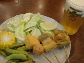 いただきます。その後、ビールに関するお話を少し聞き、おつまみの串揚げ作り。といっても・・・すでにカットされた野菜類を串に刺して油で揚げるだけ。。料理と言っていいのか考えてしまうほど簡単な料理です。
