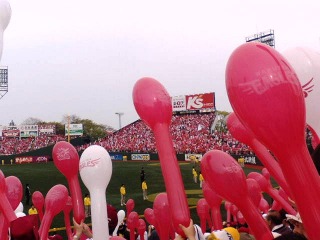 場内は、3塁側に加えて1塁側にいる人たちもほとんどが楽天ファン。7回裏の恒例の風船飛ばしは、数が半端じゃなく、試合観戦の中で一番好きな瞬間でもあります。