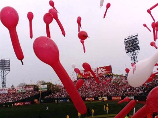 8回裏の追加点で勝利モード。試合終了後には勝利の風船が飛ばされます。7回裏の時と替わって今度は白い風船が主。観客席が真っ白に見えます。