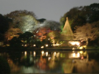 ライトアップされた庭園。一眼に三脚で撮影する人たちに交じって写真を撮ってみましたが、三脚なしでは手ブレがひどく何枚撮っても失敗作ばかり。。うまくいきません。。