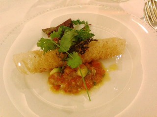 ズワイ蟹と銀杏、くわいのネットライスペーパー巻き揚げ(写真上左)