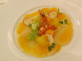 薄切り帆立貝と車海老のカルパッチョ柚子こしょう風味(写真上右)
