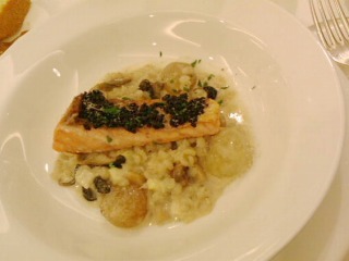 秋鮭と黒米焼き いろいろきのことマスカットリゾット添え(写真上左)