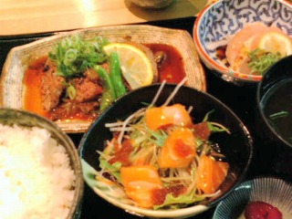 ステーキは一口サイズにカットされていますが、やわらかく美味しい。。小鉢の地鶏のお刺身や海鮮サラダもなかなかいけます。お手頃価格のうれしいランチとなりました。