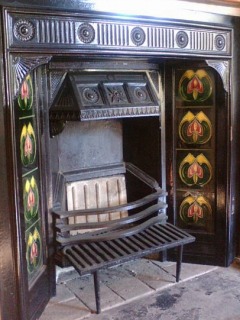 館内は見学可(入館料無料)。当時の家具などはほとんどなく、資料がたくさん展示されています。1階居間部分には、アールヌーボー風のタイルが使われたお洒落な暖炉がありました。