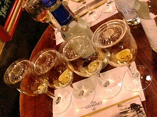 各テーブルには、グレンリベットの12年、15年、ナデューラ、18年の4種類のグラスが並び、12年から順番に試飲。ストレートではアルコールが強すぎて苦手なので、同量の水を足しての試飲です。
