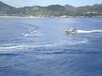 おが丸出港の時。民宿の方、ダイビングで一緒になった方々・・知っている顔を見つけては大きく手を振っての出港です。滞在中に港から見ていた並走するボートにも今日はデッキから手を振ります。お盆シーズンに入り、多くのダイビングボートが出てしまっているせいか見送り船は少なめ。。お世話になったダイビングサービスのボートも見つけられませんでしたが、多くの人たちに見送られ、「また来るね~!」と自然と言ってしまうような温かい気持ちになりました