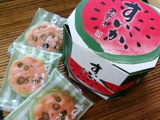 先日、大阪に行った時に買ったスイカの形をした「すいか おかき」。