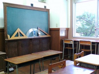 。休憩室には学校の机、黒板が置かれており、小学校の雰囲気が残っています。また、階段や窓などのデザインがとてもステキでした。