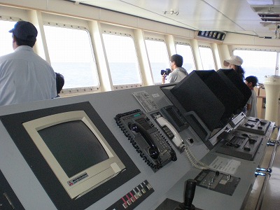 まず最初の見学は、操舵室。船の舵やレーダーなどが並んです。双眼鏡を除くと遠くの方に島影が見えます。ずっと海だけの風景だったので、ボンヤリとした形しか見えなくても何だか嬉しくなってきます。