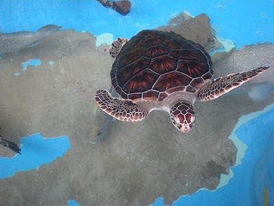 再び町を歩き、時間もあるので、水産センターへ。途中、スコールにあいながらも無事到着です。水槽にはウミガメ。センター内にも小さな魚が少しだけいます。また、帰り道にマイマイを見つけ思わず写真を撮りましたが、実はどこにでもいるらしい。。雨上がりに民宿の庭でも見かけました。。
