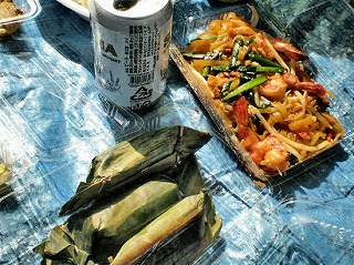 食べる場所を探していると、食事を終えた方からブルーシート付きで場所を譲ってくれるという声かけが。。で、ようやくランチです。タイの音楽が遠くに聞こえるなか、料理を並べてシンハー