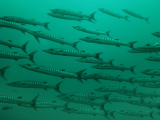 1本目。潜行してすぐギンガメアジの群れです。しかも、ギンガメアジに混じって、ロウニンアジ、ナポレオンも。しばらくすると、バラクーダが登場。こちらも群れで悠々と泳いでいます。その後もカンムリブダイやグレイリーフシャークなど見たかった魚たちが次々と登場。豪華フル出演。大満足