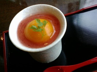 お料理は籠の中に煮物などがちょっとずつ入ったかわいらしい料理。そして、食後のデザートはストロベリーソースのかかったヨーグルトムース。ランチのデザートはどちらかというと小さめサイズになっていることが多いですが、こちらのは比較的大きめ。お料理、デザートともに美味しくいただきました。